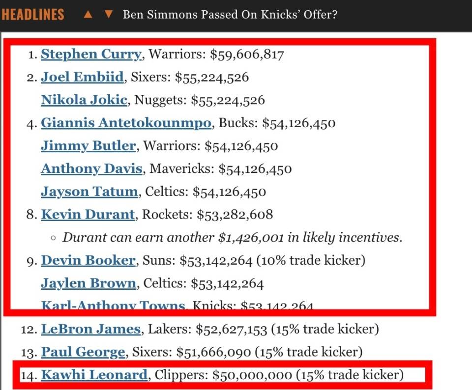 随着新赛季的日益临近,美国媒体Hoopsrumors近日公布的一份NBA球员薪资排行榜,再次让全世界的篮球迷,感受到了顶级职业体育联盟惊人的“钞能力”。在这份榜单中,排名前50位的球员,其新赛季的年薪全部超过了3250万美元。其中,金州勇士队的库里以5960万美元高居榜首,费城76人队的恩比德与丹佛掘金队的约基奇以5522万美元并列第二,字母哥、巴特勒、塔图姆等一众超级巨星也都以超过5400万美元的年薪紧随其后。伦纳德 5000万美元排14 ,而詹姆斯则 5262万7153美元排12,这一连串令人咋舌的数字,不仅是球员个人价值的体现,更是NBA联盟商业化巨大成功的缩影。(信息源:@Hoopsrumors)