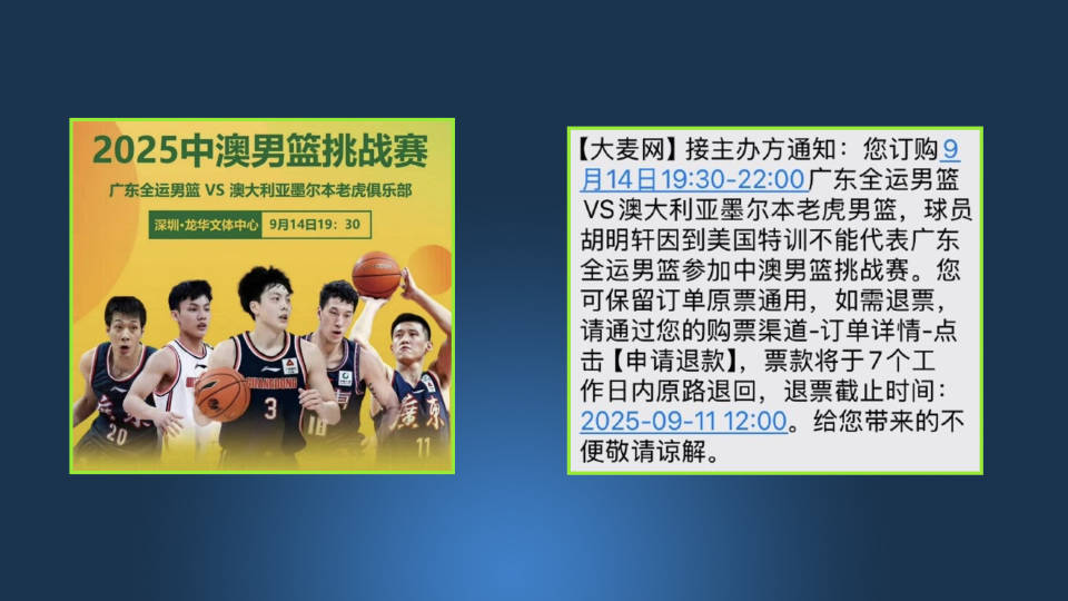 也正是在球队积极备战新赛季之际,核心后卫胡明轩也传来了最新消息。据悉,他将于近期启程赴美国进行个人特训,因此将缺席广东全运男篮在9月份的一系列热身赛,其中就包括9月14日与澳大利亚墨尔本老虎队的焦点对决。考虑到部分球迷是专门为一睹胡明轩风采而来,本次赛事的主办方也展现了人性化的一面,他们已协调售票平台,通知相关球迷,若因胡明轩的缺席而希望退票,可按流程提出全额退款申请,这一举动也获得了外界的好评。