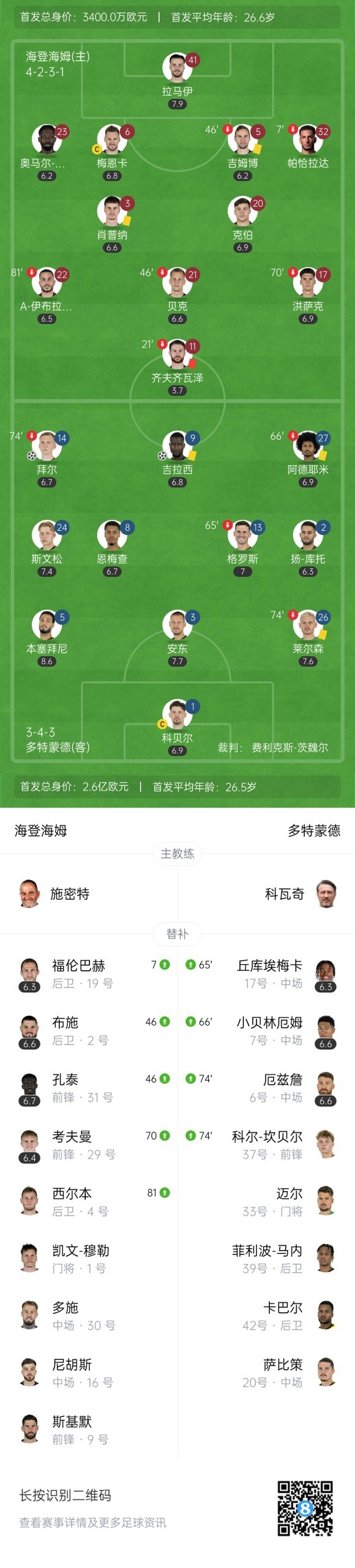 第50分钟,多特扩大比分!阿德耶米右路精彩内切过人后无私横传左路拜尔推射破门,海登海姆0-2多特。↓