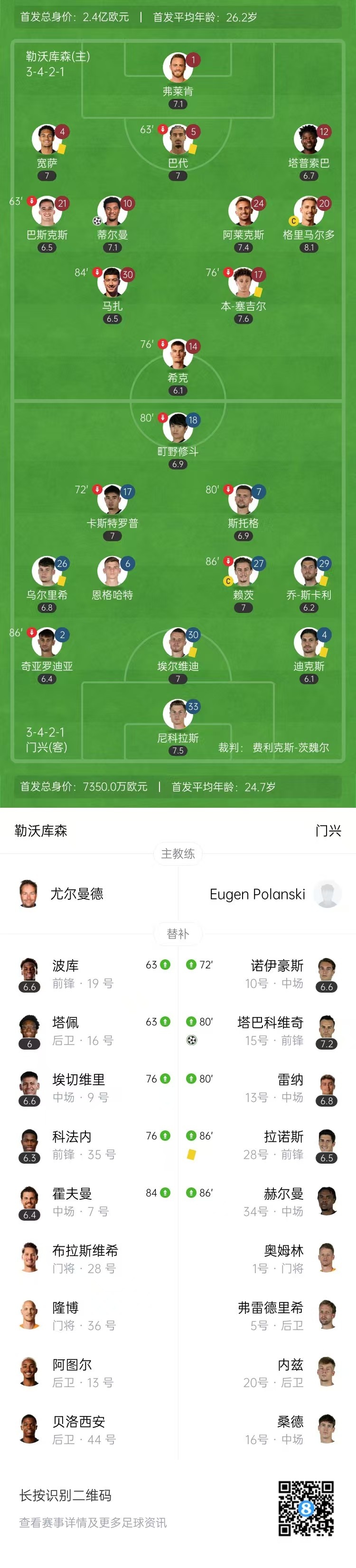 第90+2分钟,门兴右侧角球机会,塔巴科维奇中路抢点头球扳平比分,门兴1-1勒沃库森。↓