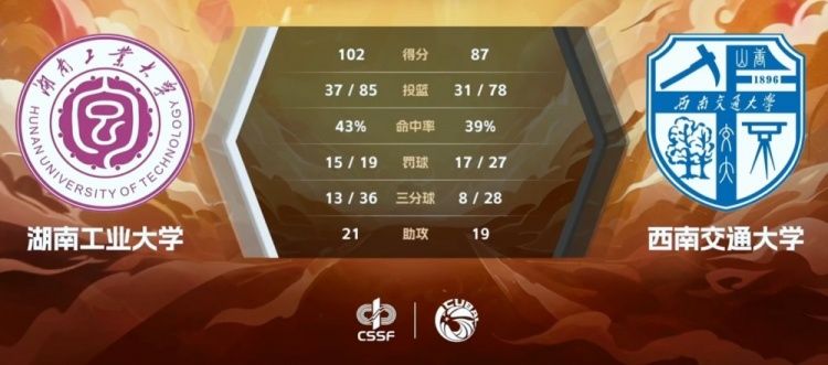 湖南工业大学:柳锐30分8篮板13助攻4抢断、张航志22分6篮板、吴子煜16分4篮板3抢断、司家丞14分4篮板3助攻、杨李杰7分6篮板、祁宏升5分、周梓峰3分2篮板2助攻。