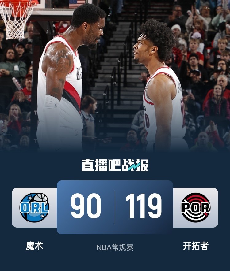 开场后魔术先声夺人以10-0开局,随后艾顿接连在篮下打进帮助开拓者逐渐打回局面,安东尼替补登场后连续得分为魔术稳住局面。第二节上来魔术进攻断电,开拓者多点开花掀起反扑将比分反超,并且逐渐将分差拉大到两位数。易边再战,魔术在进攻端依旧表现低迷,开拓者在进攻端依旧发挥稳定,场上分差一度达到25分以上,最后一节沦为两队练兵时间,开拓者依旧掌控着场上优势,最终开拓者119-90击败魔术取得2连胜,魔术遭遇2连败。