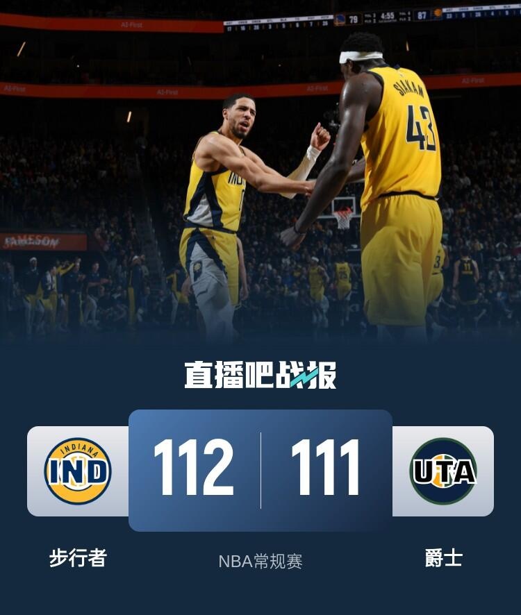 🏀西卡22+6 哈利伯顿18+6 科林斯21+12 步行者逆转爵士迎4连胜