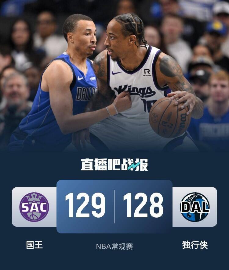比赛开始,双方都迅速进入比赛状态,国王一波9-0建立主动权,但丁威迪上场后,接连3记三分连砍12分带队轰出小高潮首节领先8分,次节加福德受伤回更衣室,但独行侠还是全民皆兵保持住微弱领先,德罗赞发力单节弹无虚发砍下14分带领国王半场抹平分差。下半场,穆雷里突外投连砍7分助队取得领先,随后欧文里突外投再次咬住比赛,克里斯蒂连续三分帮助独行侠三节领先6分,末节独行侠发力拉开双位数领先,但德罗赞里突外投连砍11分带队回应15-2攻击波再度反超比分,比赛进入白热化,欧文关键抢断后突破上篮领先2分,德罗赞后仰中投再追平,双方进入加时。加时赛,蒙克接连内线拿到8分,但欧文有攻有传强势回应,比分继续交替领先,德罗赞造杀伤两罚全中领先4分,欧文上篮后克莱三分再反超,德罗赞绝杀抛投,最终国王加时129-128险胜独行侠。