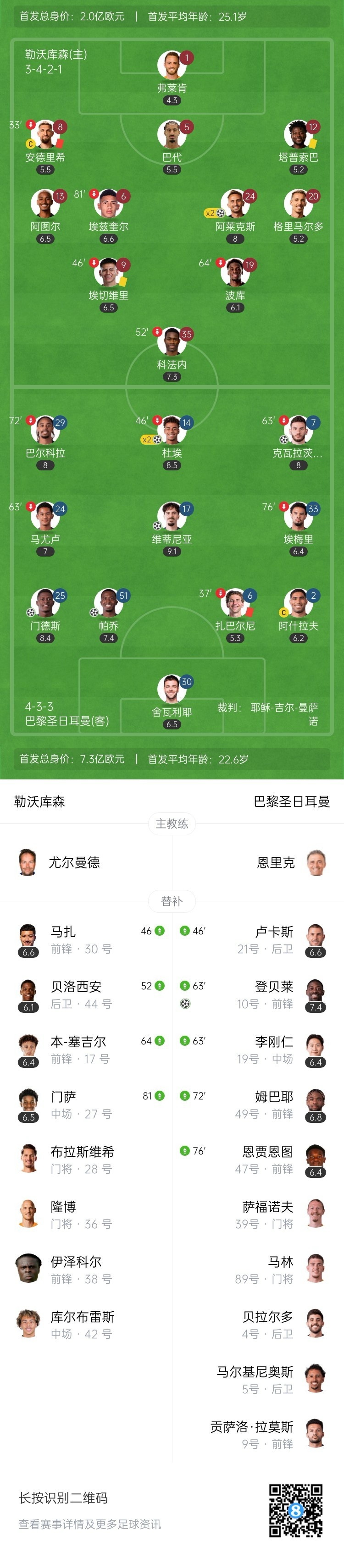 第67分钟,巴黎中场左路送出直塞,巴尔科拉前插到禁区左侧斜塞到后点,登贝莱包抄小角度破门,6-2!↓