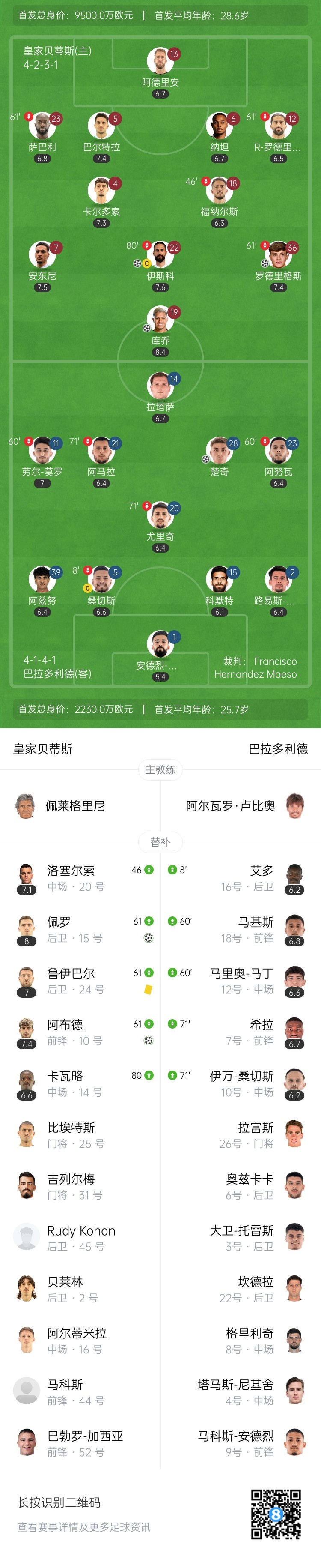 第66分钟,安东尼边路直塞策动,鲁伊巴尔倒三角扫到门前,伊斯科推射破门!贝蒂斯3-1领先巴拉多利德↓