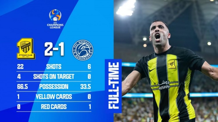 2月23日讯 北京时间2月23日凌晨0点整,2023-24赛季亚冠1/8决赛次回合展开角逐,吉达联合坐镇主场迎战纳曼干新春,双方首回合0-0战平。上半场本泽马自摆乌龙&头球助攻,哈姆达拉扳平比分,下半场塔巴塔泽诡异乌龙,东契奇飞踹染红。最终吉达联合主场2-1战胜纳曼干新春,总比分吉达联合2-1淘汰对手晋级八强。