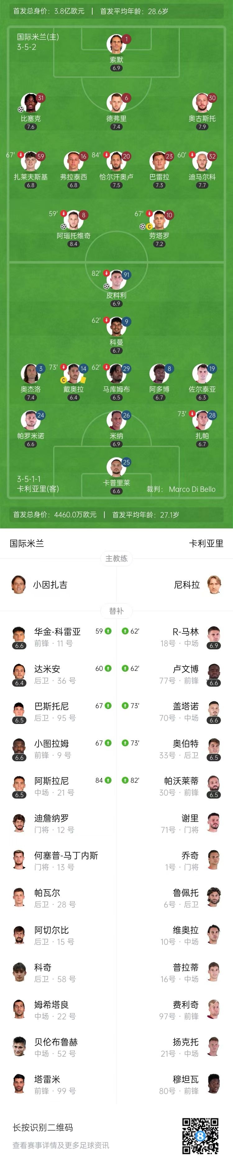 4月13日讯 北京时间4月13日0:00,意甲第32轮,国际米兰坐镇主场梅阿查球场迎战卡利亚里。上半场,阿瑙托维奇爆射破门,随后助攻劳塔罗扩大比分。下半场,皮科利头槌扳回一城,比塞克头槌再度扩大比分,德弗里门前救险。全场比赛结束,国际米兰主场3-1击败卡利亚里,先赛一场领先第二名的那不勒斯6分。