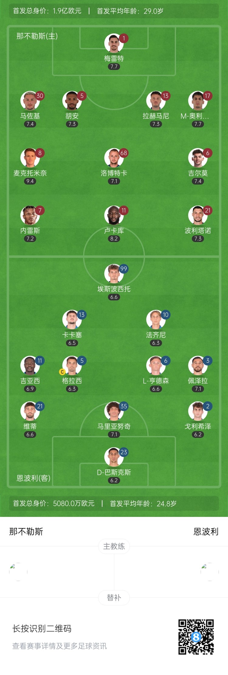 意甲-那不勒斯3-0恩波利落后国米3分 卢卡库1射2传麦克托米奈双响