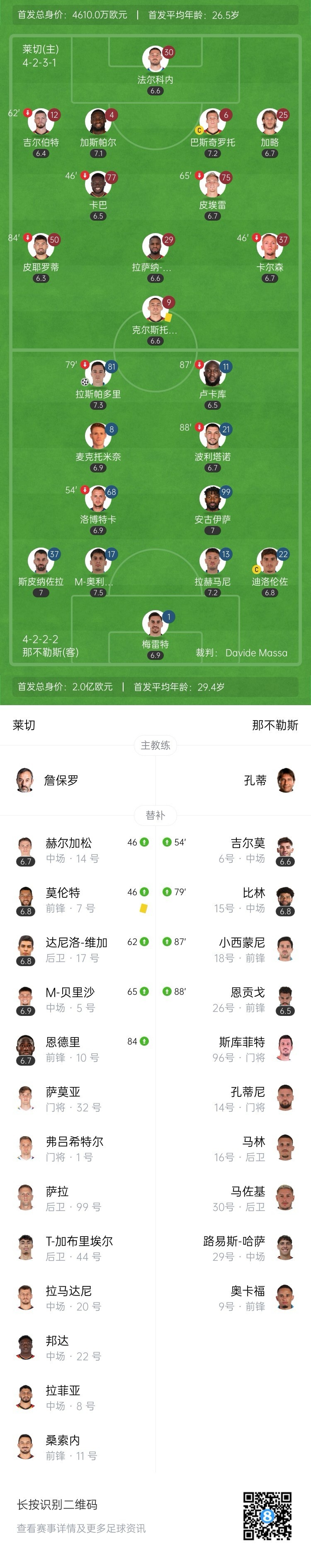 全场比赛结束,那不勒斯1-0击败莱切。