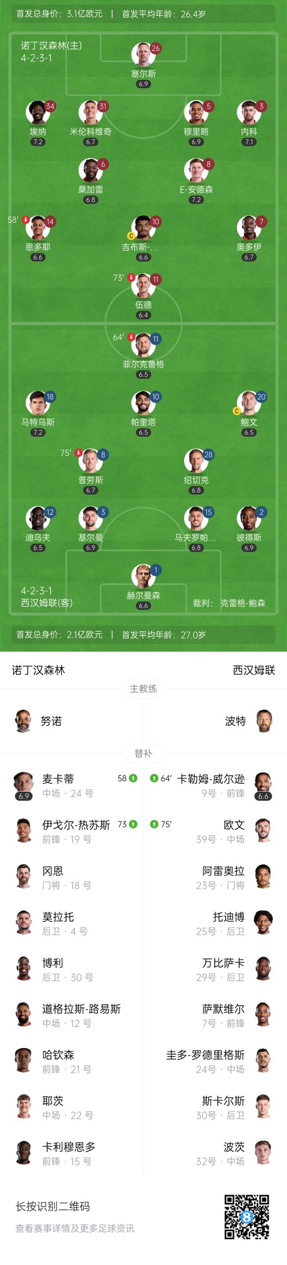 第83分钟,西汉姆打破僵局!萨默维尔前场拿球突破到弧顶横传给到鲍文抽射破门,森林0-1西汉姆。↓
