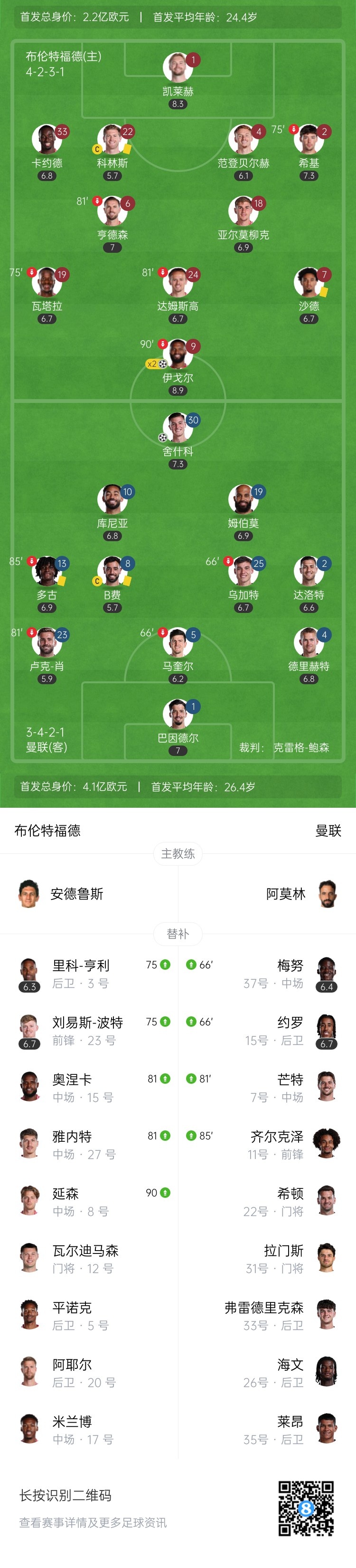 6轮7分!曼联1-3布伦特福德六轮三负 B费关键失点舍什科处子球