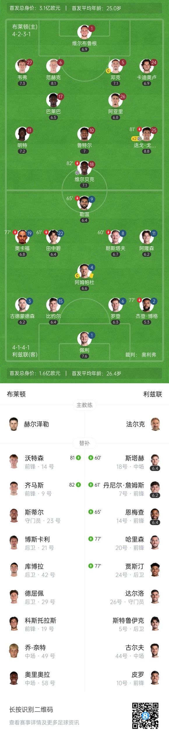 上半场补时1分钟,布莱顿1-0利兹联。