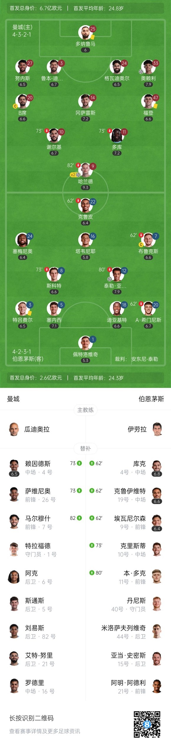 下半场补时5分钟,曼城3-1伯恩茅斯。