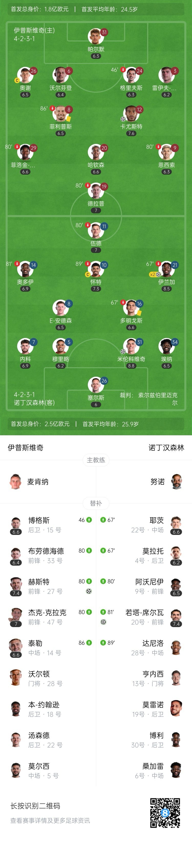 第35分钟,诺丁汉森林取得领先,奥多伊起球,队友头球顶向门前,德拉普头球解围不远,米伦科维奇抽射破门,森林1-0领先伊普斯维奇。↓