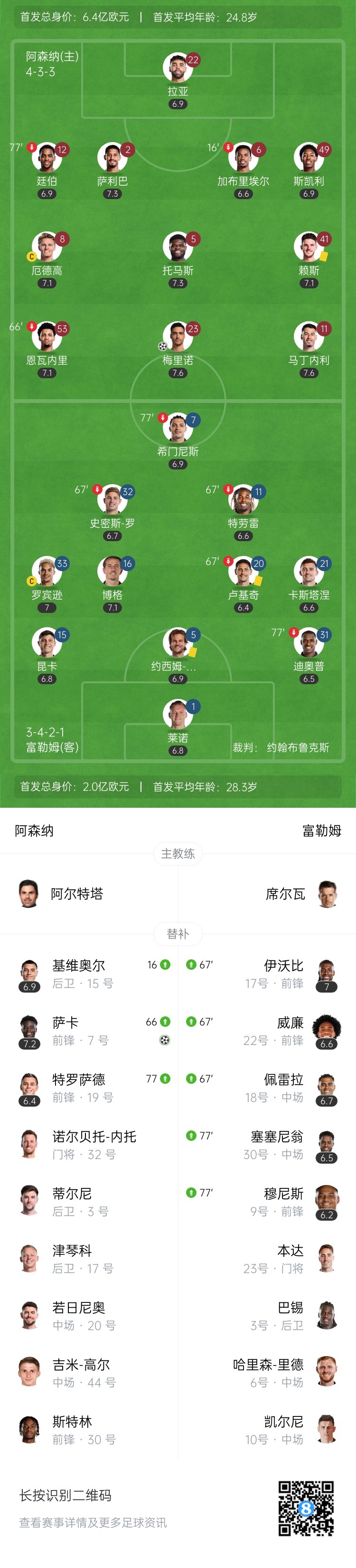 第66分钟,萨卡复出替补登场,换下恩瓦内里。↓