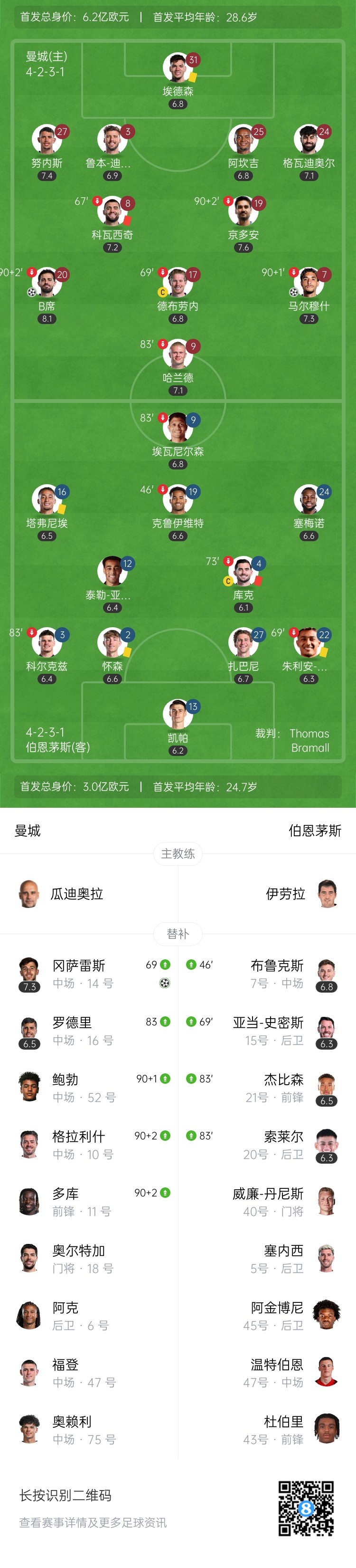 曼城3-1伯恩茅斯升至第三 马尔穆什世界波丁丁告别罗德里复出