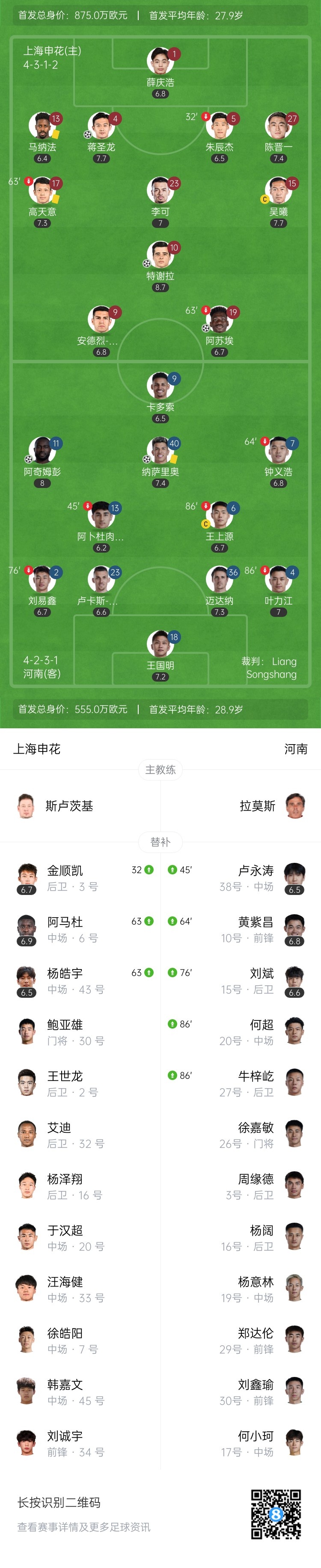 全场比赛结束,最终上海申花3-2河南。