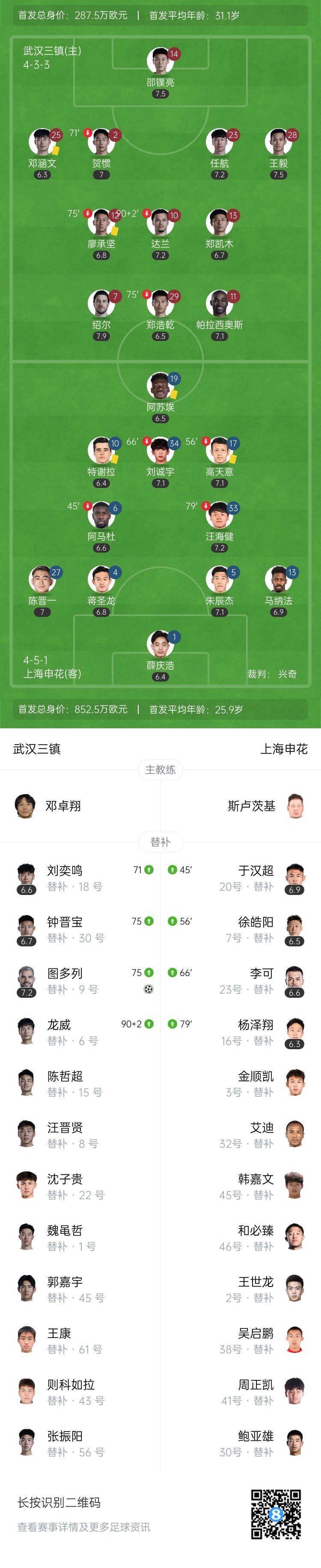 第89分钟,图多列反越位成功,单刀面对门将推射破门!武汉三镇1-0领先上海申花↓