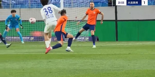 第32分钟,大连英博客场取得领先,拉布亚德左路角球开至后点被解围出禁区,吕焯毅停球之后起脚远射,皮球飞入远角,英博1-0领先青岛海牛。↓