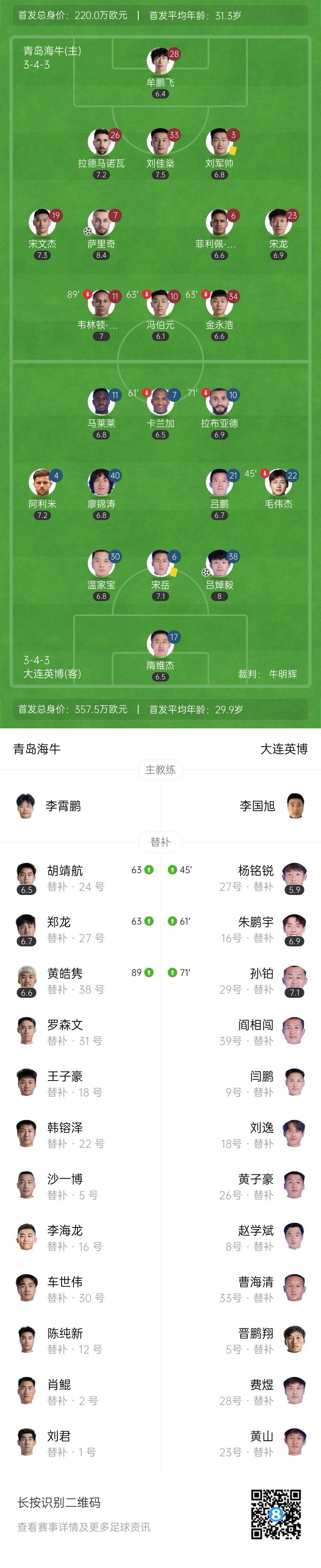 全场比赛结束,青岛海牛主场1-1大连英博。