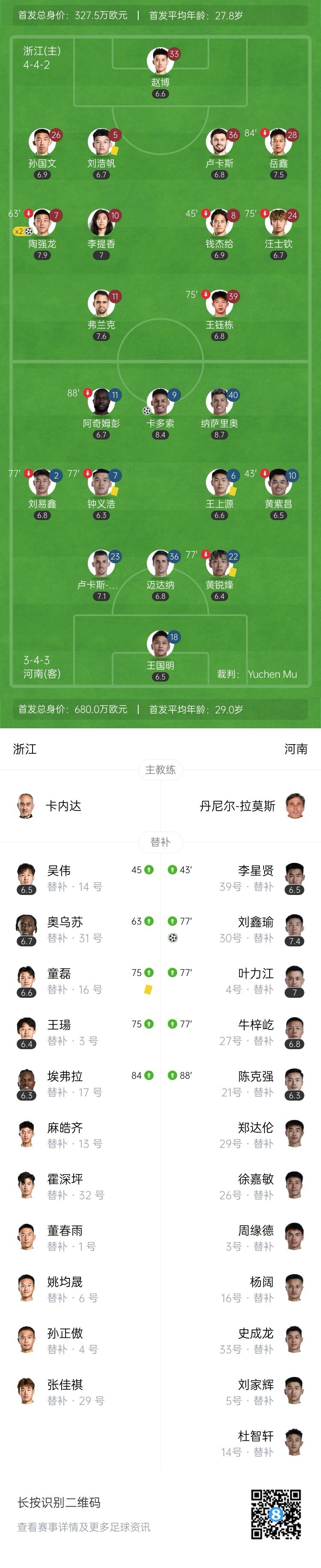 全场比赛结束,浙江主场2-2遭河南绝平。