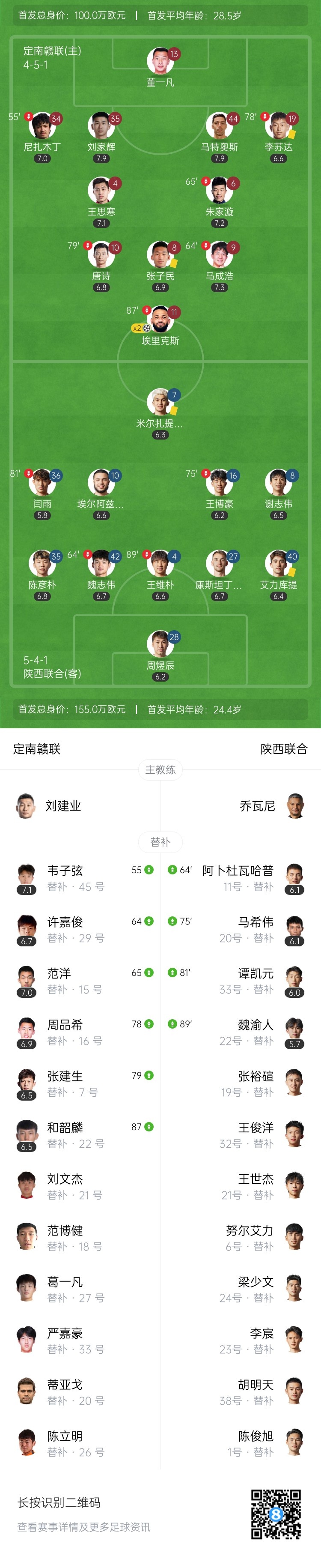 中甲-定南赣联2-0陕西联合6轮不败升第9 埃里克斯双响制胜