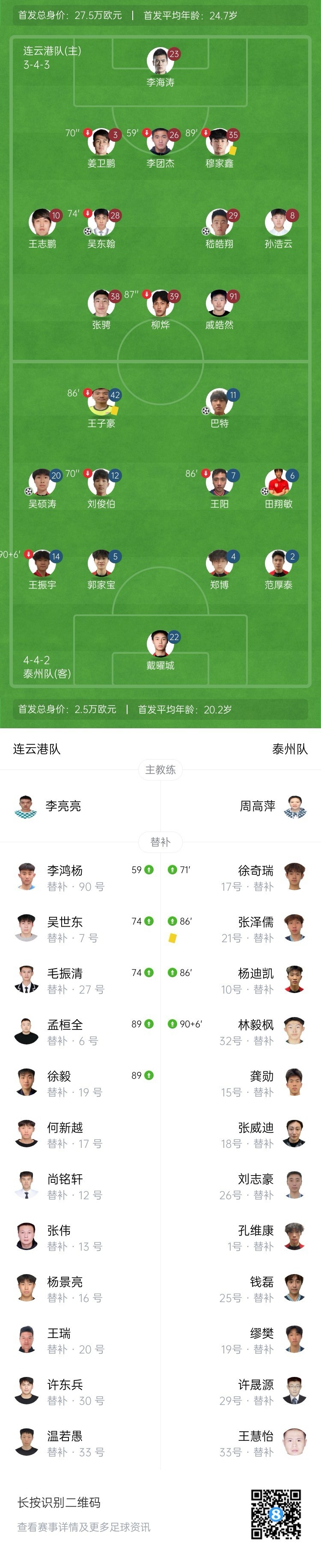 泰州反超比分!第65分钟,泰州的任意球开出,门将李海涛出击没能破坏皮球,田翔敏补射空门得分,连云港2-3泰州!↓