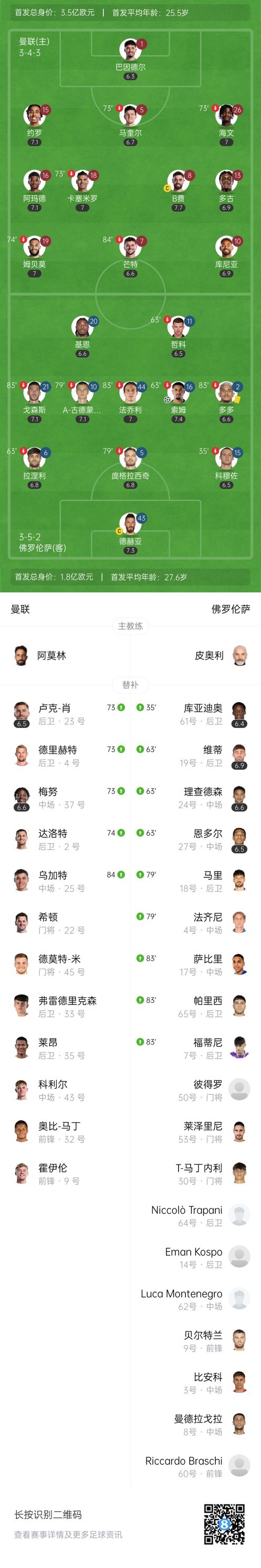 第25分钟,曼联扳平比分!左路角球开到禁区后点戈森斯头球自摆乌龙,曼联1-1佛罗伦萨。↓