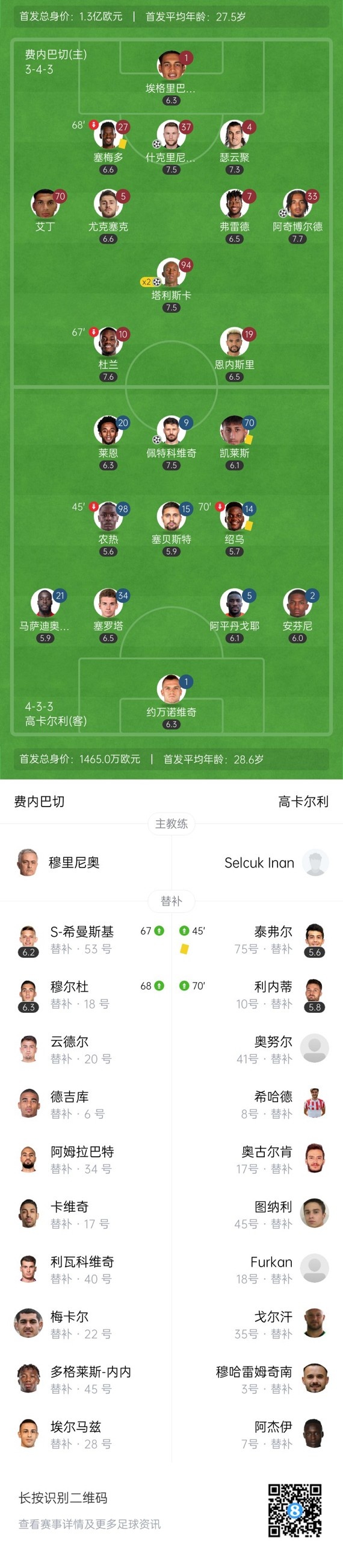 下半场补时5分钟,费内巴切3-1高卡尔利。