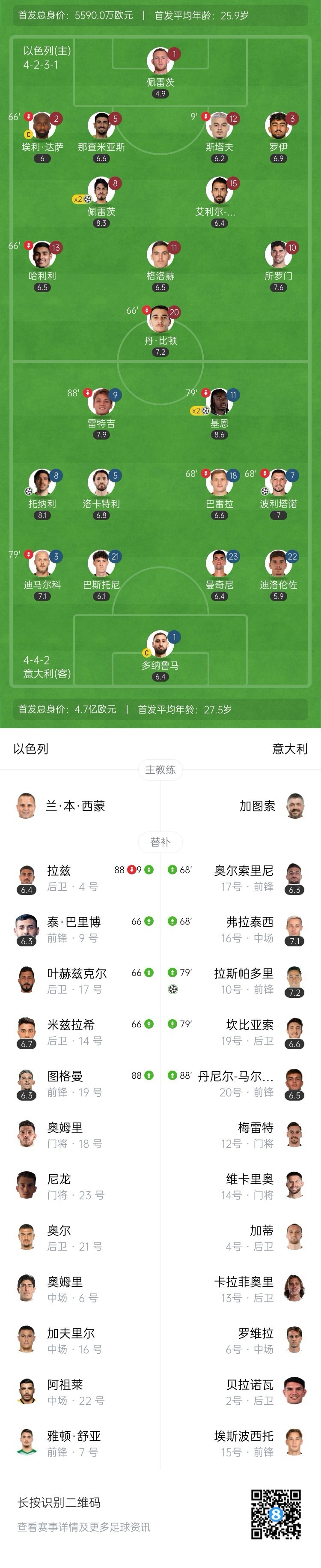第89分钟,以色列挑传到禁区内,多尔-佩雷兹接应队友摆渡,门前头球冲顶破门,4-4!↓