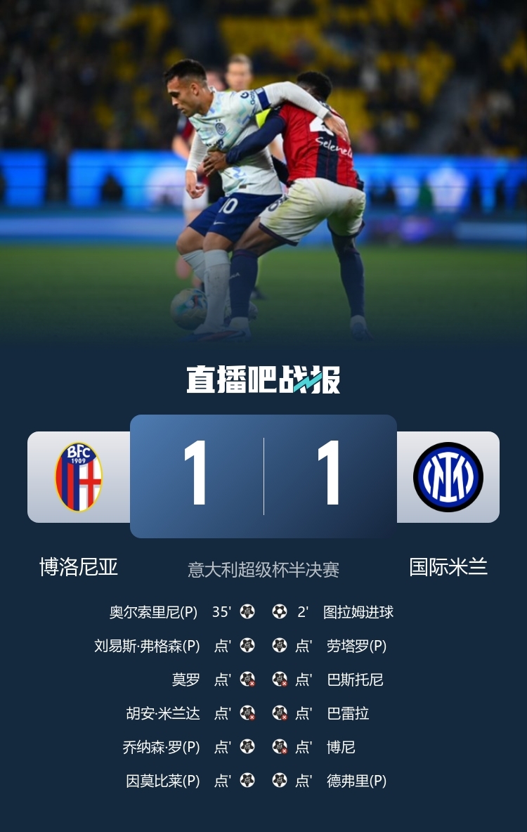 12月20日讯 意大利超级杯半决赛,博洛尼亚对阵国际米兰,比赛在沙特国王大学体育场进行。上半场,小图拉姆2分钟闪击建功,比塞克手球送点,奥尔索里尼点射建功,贝纳德斯基伤退。易边再战,VAR取消国米点球。最终常规时间国米1-1博洛尼亚直接进入点球大战。点球大战国米巴斯托尼、巴雷拉、博尼失点。最终博洛尼亚常规时间1-1,点球大战3-2国米晋级决赛,将对阵那不勒斯。