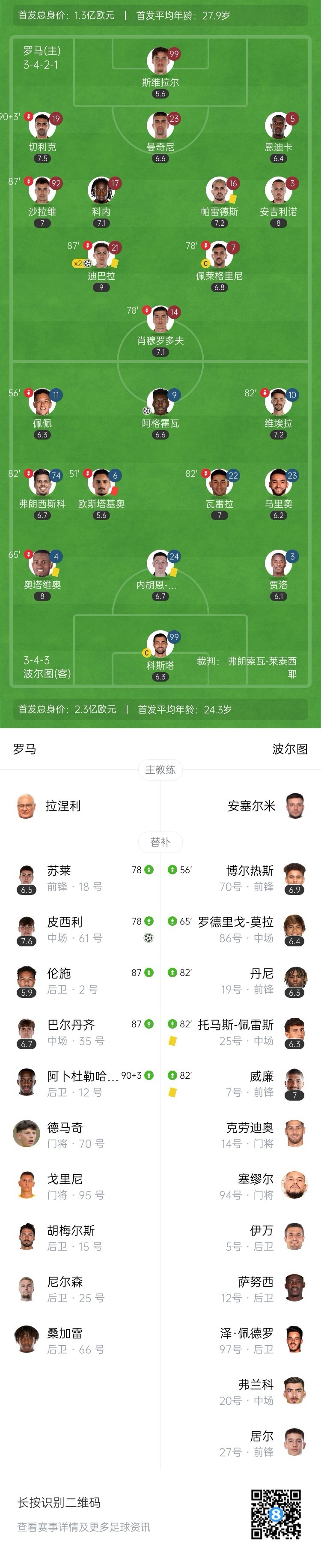 全场比赛结束,罗马主场3-2逆转十人波尔图,总比分罗马4-3淘汰波尔图晋级。