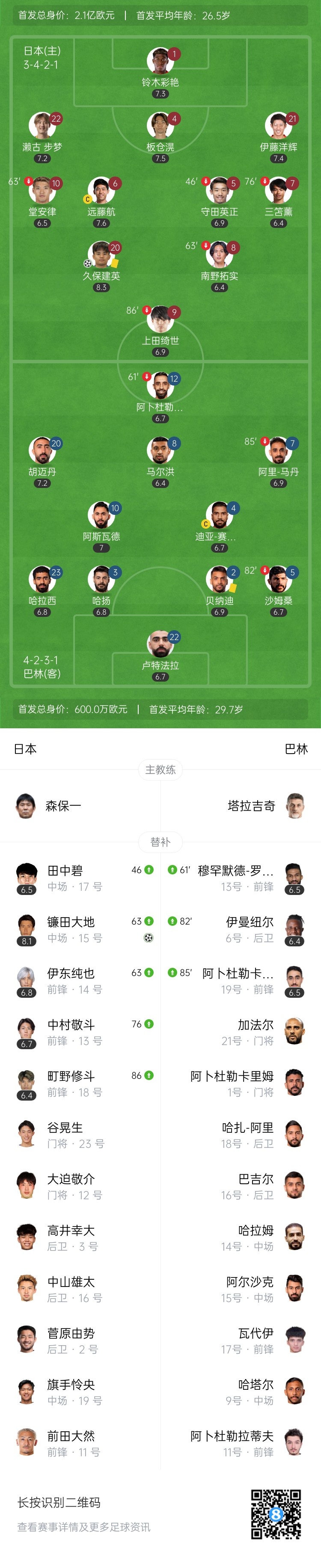 全场比赛结束,日本2-0巴林。
