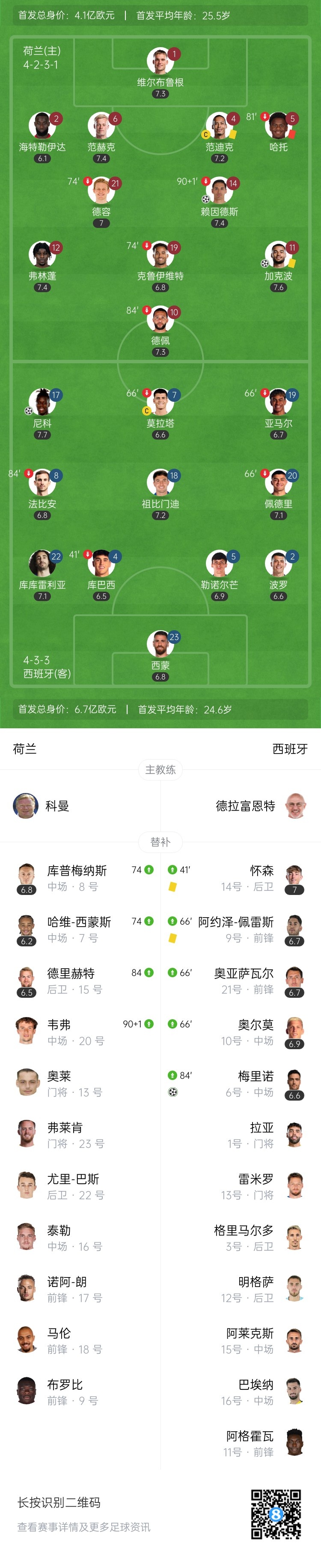 下半场伤停补时5分钟,全场比赛结束,最终荷兰2-2西班牙。