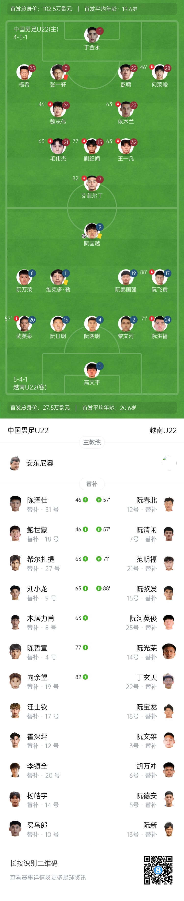 下半场伤停补时4分钟,全场比赛结束,最终U22国足1-1越南U22。
