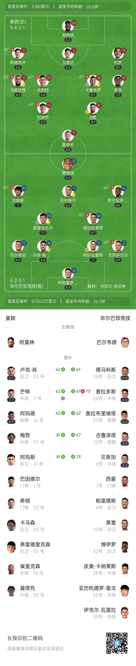 第79分钟,曼联反超比分!右路定位球开到禁区前点卡塞米罗头球后蹭破门,曼联2-1毕尔巴鄂。↓