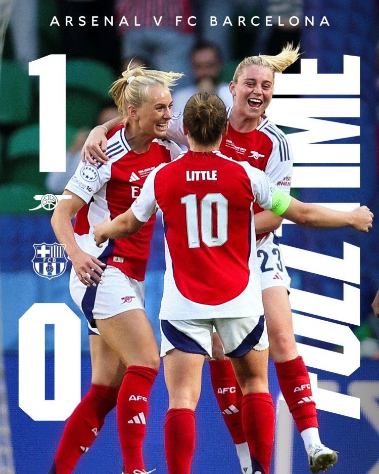 全场比赛结束,阿森纳女足1-0战胜巴萨女足夺得欧冠冠军。