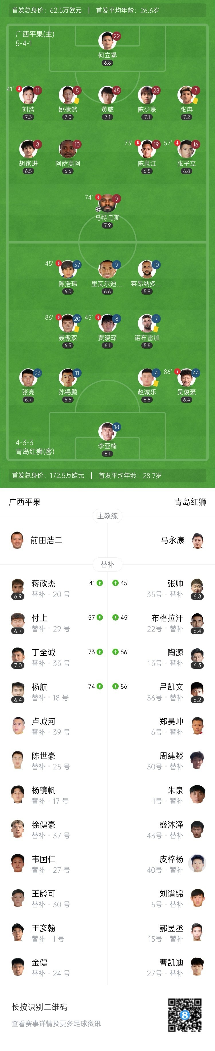 全场比赛结束,广西平果主场1-0战胜青岛红狮。