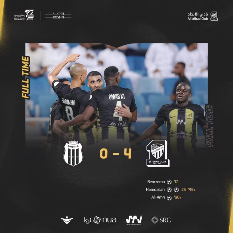 吉达联合首发:34-格罗赫、33-奥拉扬、20-沙拉希利、4-奥马尔-豪萨伊、12-扎卡里亚-豪萨伊(45'28-巴沙特)、8-法比尼奥、7-坎特(80'77-阿姆里)、10-科罗纳多、90-罗马里尼奥(65'11-若塔)、99-哈姆达拉(70'6-法尔汉)、9-本泽马