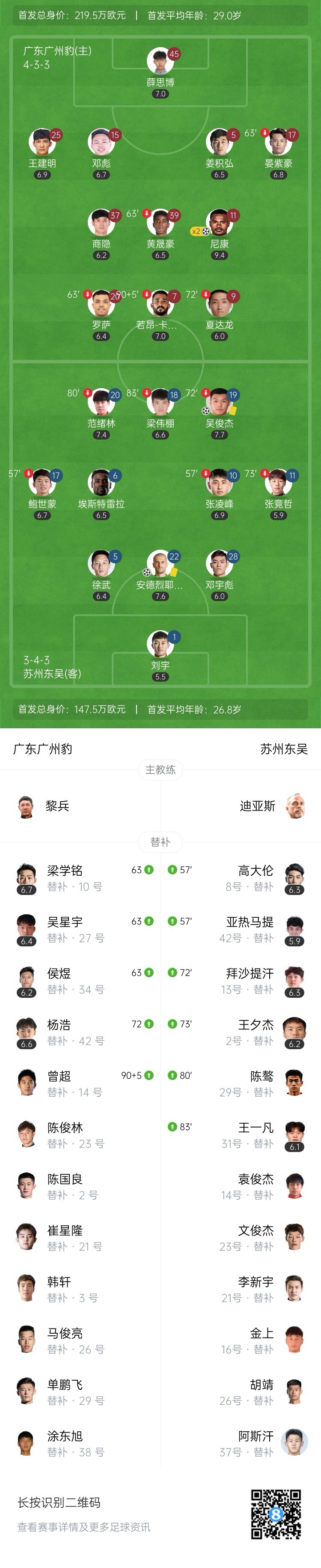 第72分钟,广州豹攻势,安德烈耶维奇解围至禁区外围,尼康得球后远射,皮球发生折射飞入球网,广州豹2-2苏州东吴。↓