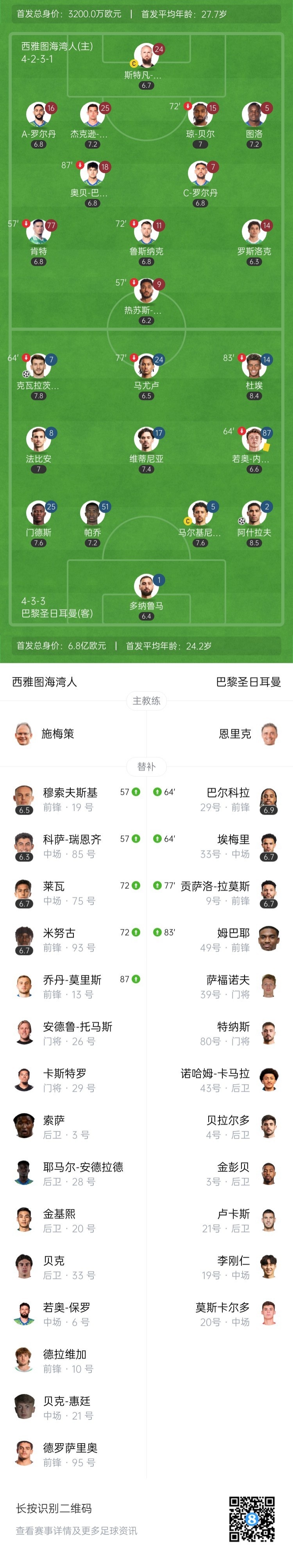 第35分钟,巴黎右侧角球开到禁区,西雅图解围不远,弧顶位置维蒂尼亚迎球推杆,皮球击中克瓦拉茨赫利亚折射入网,巴黎1-0领先↓