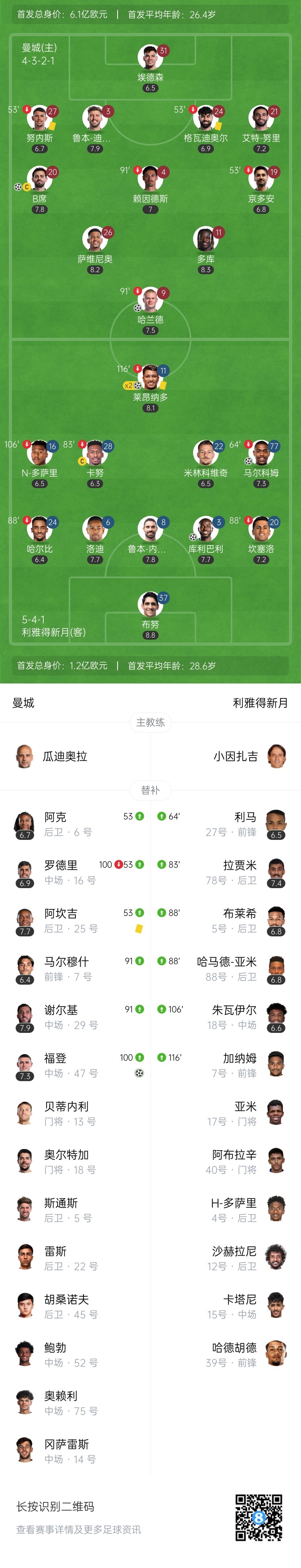 第104分钟,瓜迪奥拉神换人奏效!替补登场的谢尔基斜传后门柱位置,同样替补登场的福登小角度破门!曼城3-3再次扳平新月↓