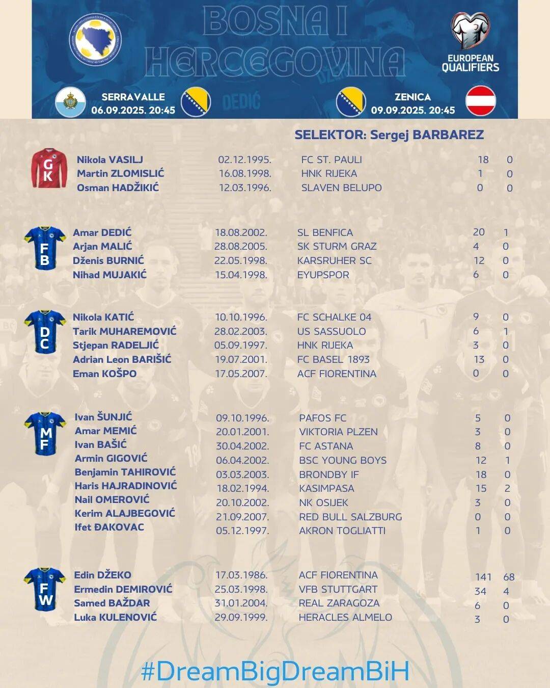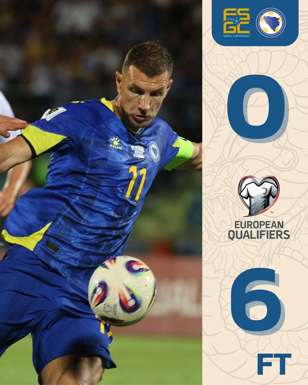 波黑在欧洲杯预选赛中表现糟糕,仅仅排名小组倒数第二的他们依靠欧洲国家联赛的战绩跻身附加赛,但很快在第一轮就败给乌克兰出局。波黑主帅巴巴雷茨在去年的欧洲国家联赛中率队两平四负垫底降级,不过顶着骂名的汉堡名宿利用这六场比赛考察演练了球员阵容。波黑在三月的两场世界杯预选赛中击败罗马尼亚和塞浦路斯,这是两支争夺小组第二的主要球队。近两场他们面对的是业余球员为主的圣马力诺,六分是意料之中的事情。果不其然,在上周的比赛中,波黑前往塞拉瓦莱6-0横扫对手。波黑在泥泞的场地上很快占据人数优势,布隆德比的塔希洛维奇、哲科、萨拉戈萨前锋巴日达尔、萨尔茨堡边锋Kerim Alajbegovic和埃尤普体育中卫Nihad Mujakic分别进球。