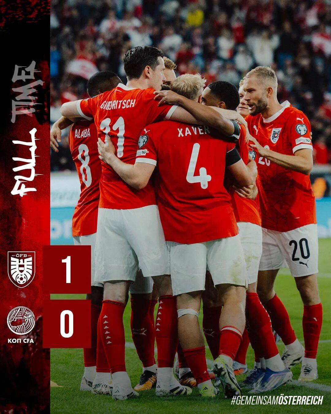 奥地利在上周的世界杯预选赛中主场1-0击败塞浦路斯获得三连胜,此前他们已经击败了罗马尼亚和圣马力诺。奥地利的首发门将是萨尔茨堡红牛的施拉格,四名后卫是美因茨的姆维内、弗赖堡的林哈特、皇家马德里的阿拉巴和拜仁慕尼黑的莱默。两名后腰是莱比锡红牛的哈维施拉格和Nicolas Seiwald,两名边锋是沃尔夫斯堡的维默和莱比锡红牛的鲍姆加特纳,多特蒙德萨比策出任前腰,贝尔格莱德红星的阿瑙托维奇担任前锋。奥地利开场被塞浦路斯压制,塞浦路斯前锋皮塔斯射门中柱。下半场鲍姆加特纳射门后脚踝被西里斯踢中获得点球,萨比策主罚命中,最终凭借这粒争议进球奥地利小胜过关。