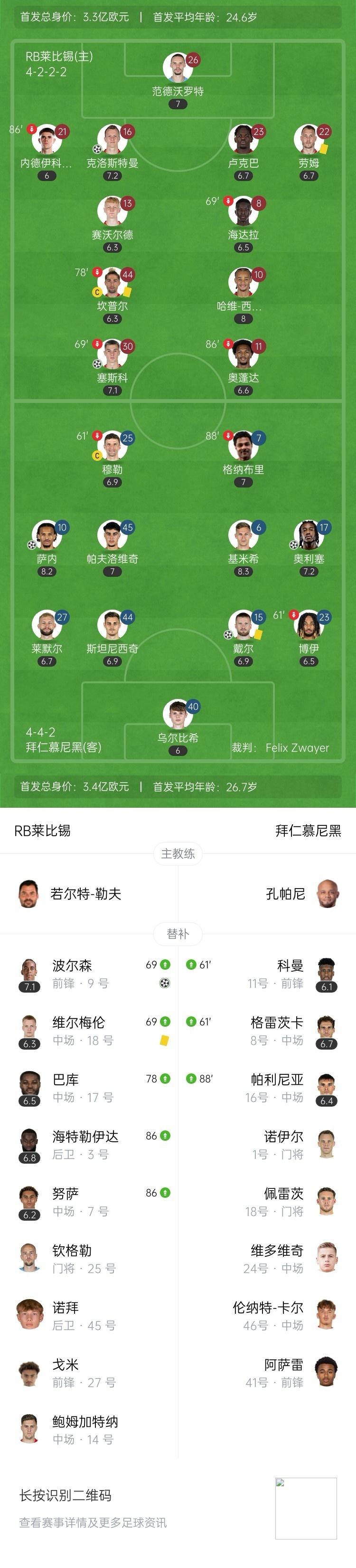 拜仁扳回一城!戴尔头球破门,奥利塞角球助攻!第62分钟,奥利塞主罚角球传中,戴尔前点甩头攻门入网,莱比锡2-1拜仁!↓