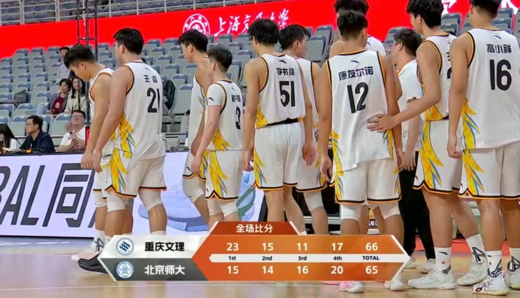 末节决战,肖洋上来就扔进三分追到差1分,程千曜三分迅速回应止血,随后双方又是2分钟互交白卷,王睿中投打破僵局,但邵振恒里突外投连续取分回应并反超比分,双方展开胶着拉锯战。吴士广打成2+1后张彦池中投加连续罚球回应,重庆文理反超1分,但邵振恒反击强硬上篮2+0再次反超回来,王睿连续篮下机会把握不住,但邵振恒发球违例,曾宇突破抛投又反超1分,肖洋突破上篮不中,吴士广补篮再丢,最终重庆文理66-65险胜北京师大。