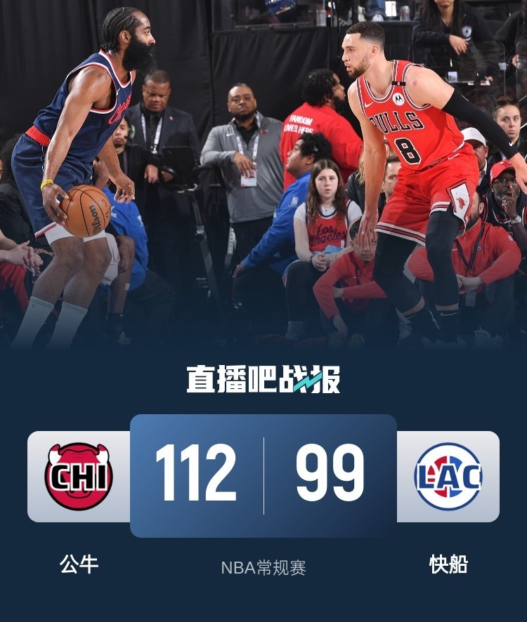 🏀哈登17中5 拉文35分 小卡&祖巴茨缺阵 快船不敌公牛结束4连胜