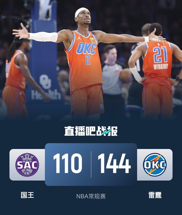 比赛上来,两队打得相对胶着,不过在首节后半段雷霆逐渐占据场上主动,亚历山大单节就拿到13分,次节场上完全呈现出一边倒的局面,国王命中率下滑的同时也防不住,雷霆单节轰下46分,分差也是直逼三十分,半场结束时国王落后27分;下半场回来,国王的表现有所好转并有反扑势头,但是依旧难以限制雷霆的进攻,分差一直保持在二十分以上,比赛在末节也没有再生波澜,最终雷霆大胜国王拒绝连败。