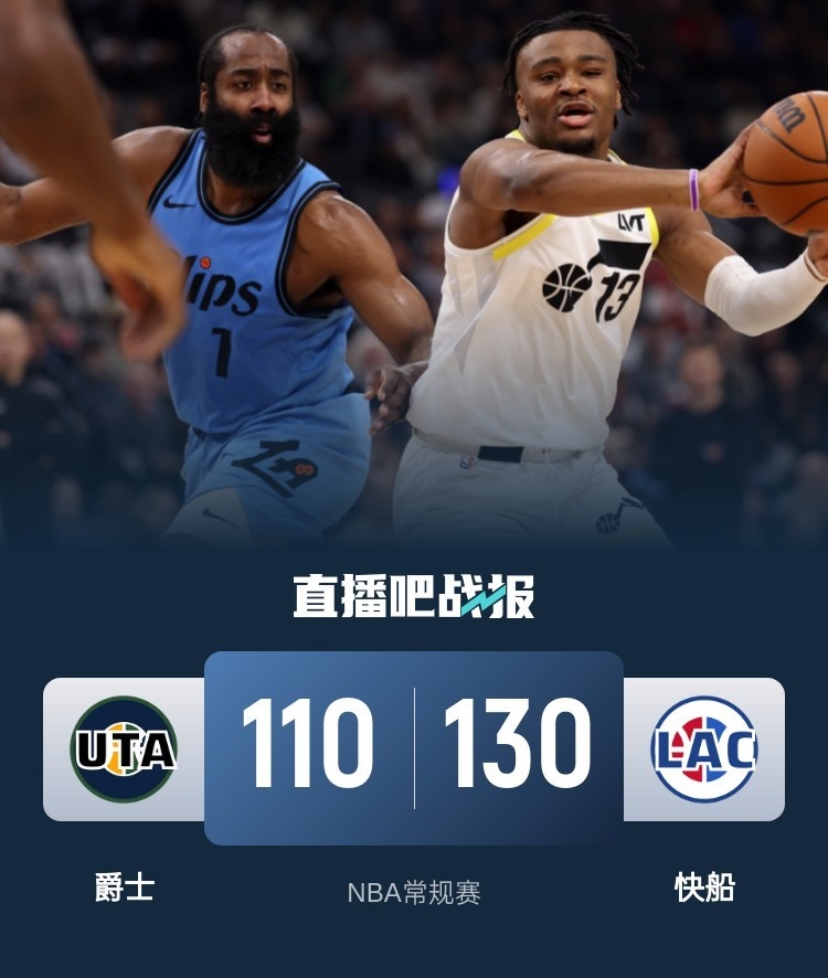 🏀哈登23+17 祖巴茨26+15 小卡9投10分 快船力克爵士止3连败
